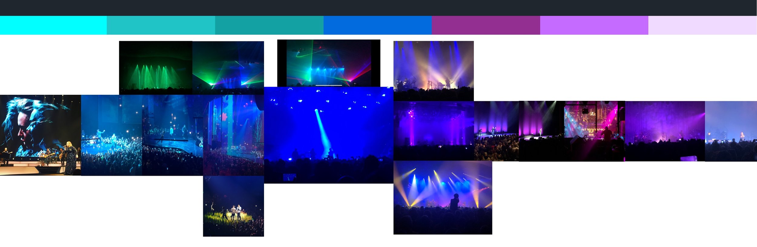 I started with color. I collected photos from concerts that my team members and I had been to and eye dropped colors from the photos. These were the Colors of Live.